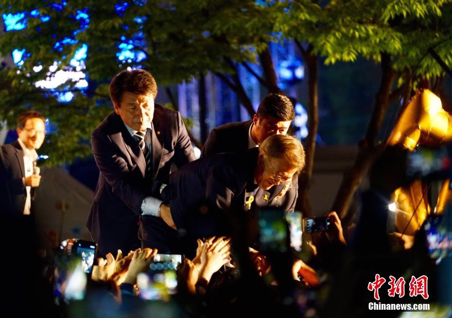 當(dāng)?shù)貢r(shí)間5月9日深夜,韓國(guó)第19屆總統(tǒng)選舉共同民主黨候選人文在寅及其競(jìng)選團(tuán)隊(duì)現(xiàn)身首爾光化門廣場(chǎng),發(fā)表“勝選演說(shuō)”,與支持民眾握手慶祝。據(jù)出口民調(diào)顯示,文在寅在當(dāng)日進(jìn)行的大選投票中以41.4%的支持率絕對(duì)優(yōu)勢(shì)勝選。在選舉管理委員會(huì)公布的大部分開票結(jié)果中,文在寅得票率也遙遙領(lǐng)先,提前鎖定勝局。 中新社記者 吳旭 攝