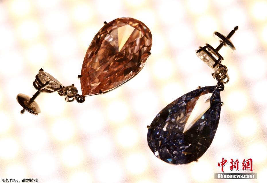 當(dāng)?shù)貢r間2017年5月11日,瑞士日內(nèi)瓦,14.54克拉的“阿波羅藍(lán)”和16克拉的“阿耳特彌斯粉”鉆石耳環(huán)即將在蘇富比拍賣行拍賣,估價分別為3800-5000萬美元和1250-1800萬美元。
