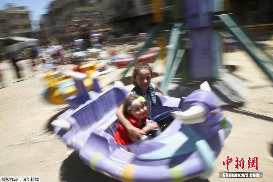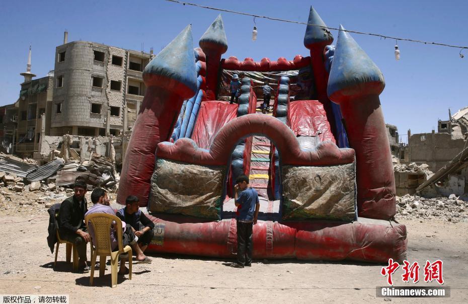 當(dāng)?shù)貢r(shí)間2017年6月26日,敘利亞反對派控制區(qū)杜馬,兒童在臨時(shí)的游樂園玩玩耍慶祝開齋節(jié)。