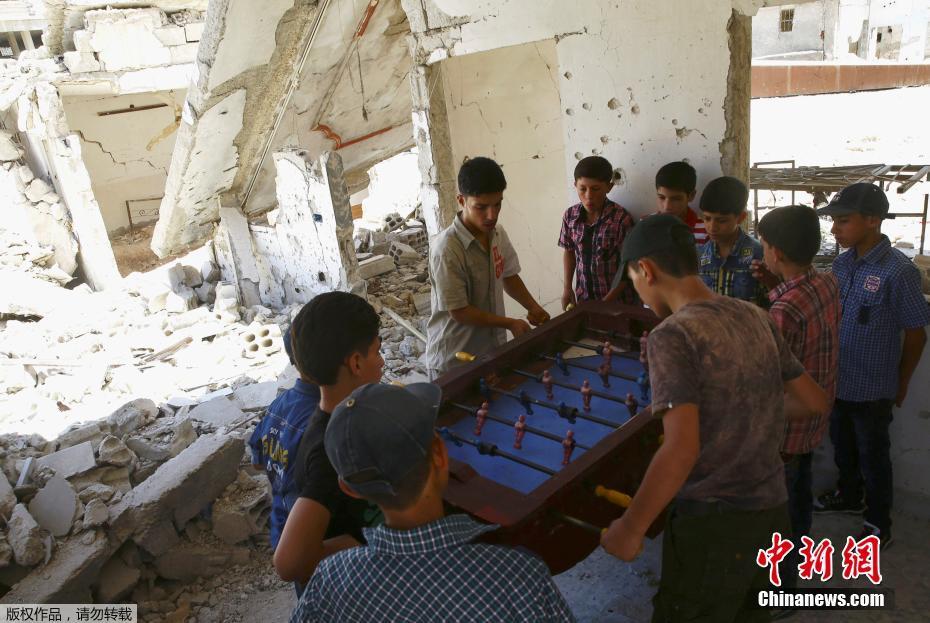 當(dāng)?shù)貢r(shí)間2017年6月26日,敘利亞反對派控制區(qū)杜馬,男孩在廢棄的建筑內(nèi)玩桌上足球慶祝開齋節(jié)。