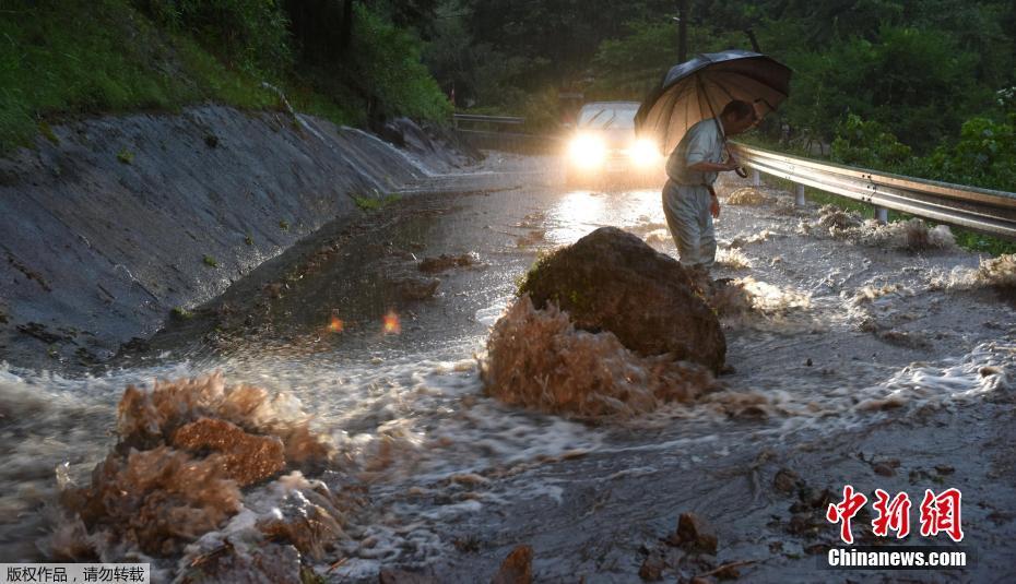 當?shù)貢r間2017年7月5日,臺風“南瑪都”為日本九州地區(qū)帶來強降雨。圖為九州島大分縣,大雨導致巨石滾落,交通癱瘓。