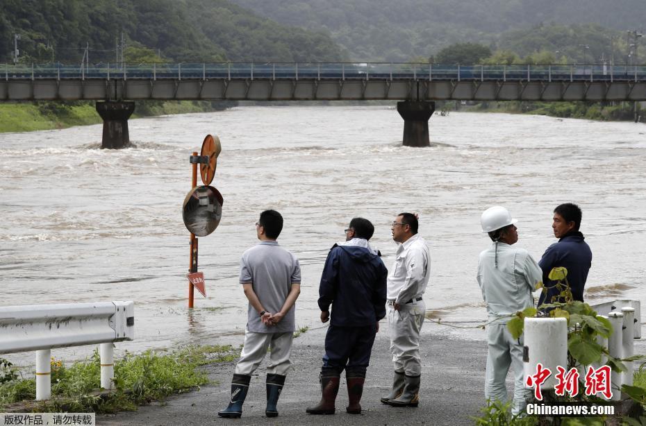 日本氣象廳表示,南瑪都4日登陸后吹向東北方,繼而轉移到四國地區(qū),晚上開始掠過關西及關東地區(qū)。圖為四國地區(qū)三好市,道路被水淹沒,人們“望洋興嘆”。