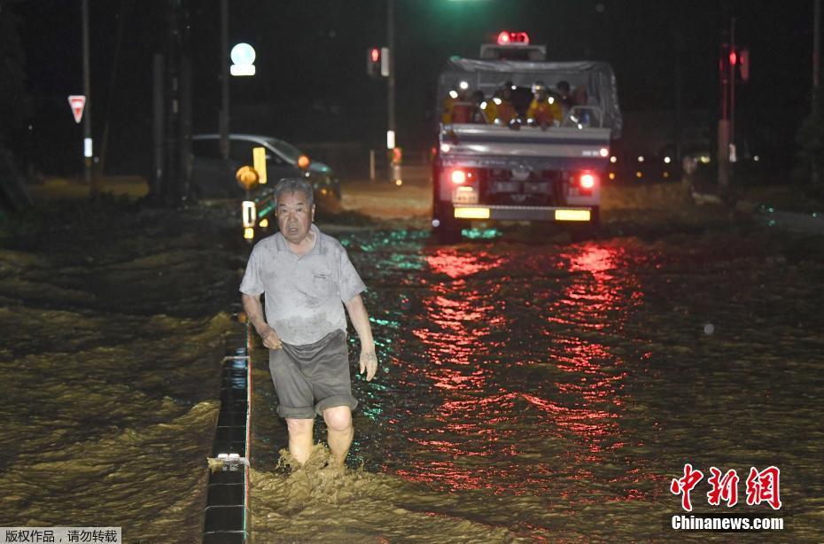臺風導致日本最少47班國內(nèi)線航班取消,3000名旅客受影響,3人因風暴引起的事故受傷。圖為福岡縣朝倉地區(qū)的居民在洪水中跋涉。