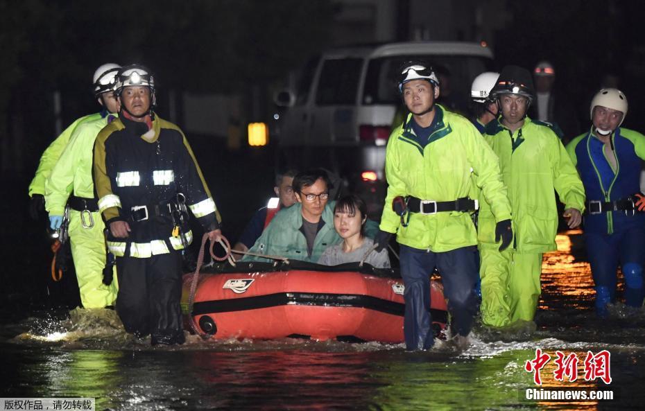 “南瑪都”預計掠過日本東部地區(qū),首都東京周邊地區(qū)將受災,地方當局呼吁逾2萬人疏散。圖為福岡縣朝倉地區(qū)的消防人員出動,解救被洪水圍困的居民。