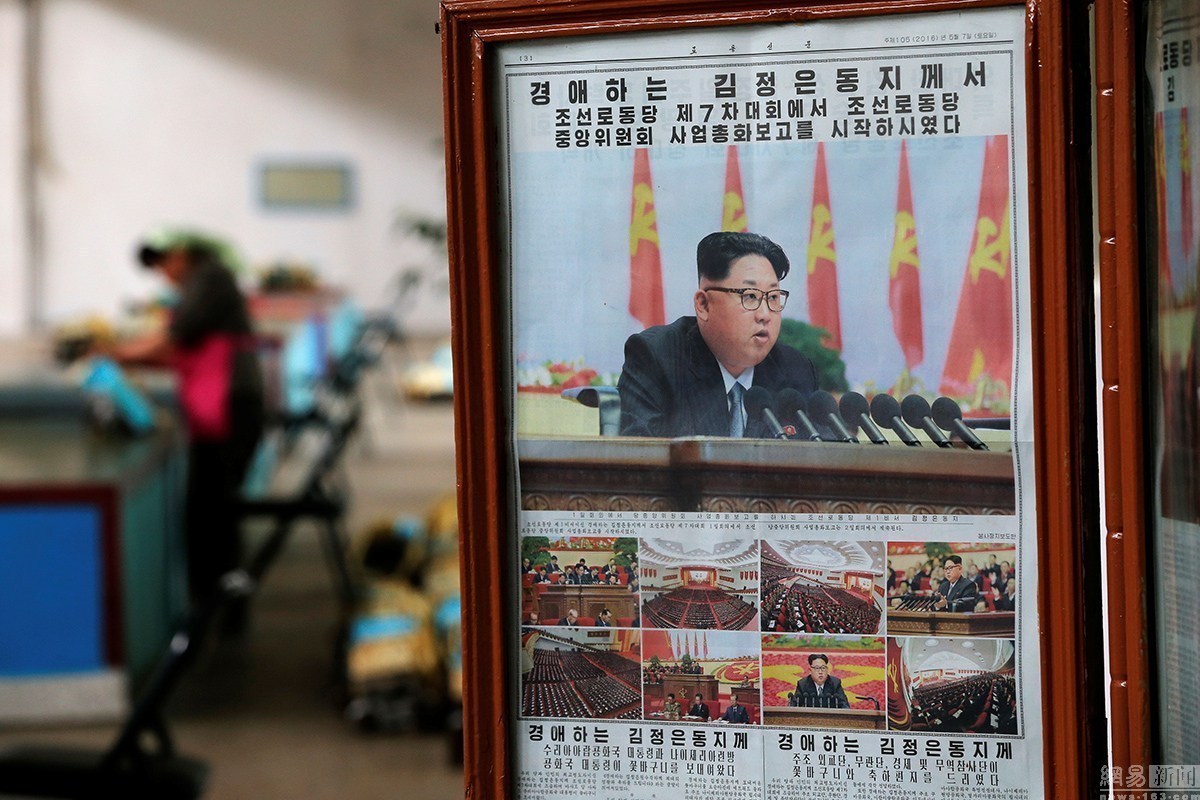 圖為紡織廠大廳內(nèi)放置著報(bào)道朝鮮七大相關(guān)內(nèi)容的報(bào)紙。