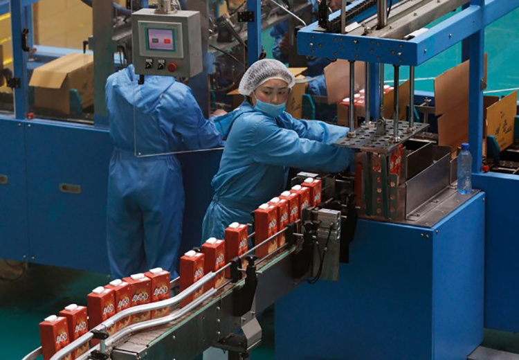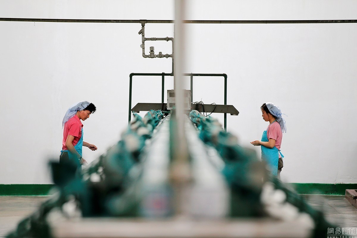 工人在一家工廠的果汁生產(chǎn)線進(jìn)行操作,這附近的Daedonggang水果農(nóng)場坐落在平壤郊區(qū),擁有125公頃的蘋果樹。