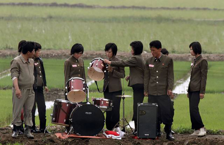 在黃金坪舉辦完歡迎農(nóng)民的儀式后,樂隊(duì)成員再在田間檢查鼓。