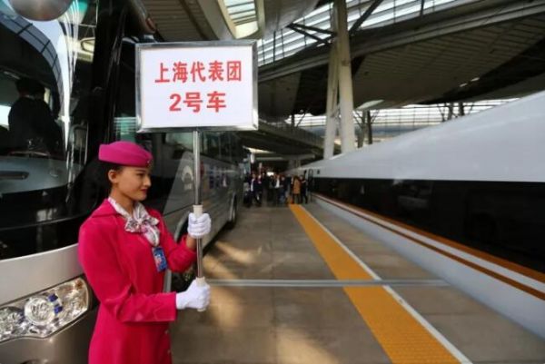 ▲2017年10月16日,上海市十九大代表乘坐“復興號”高鐵列車抵達北京南站。