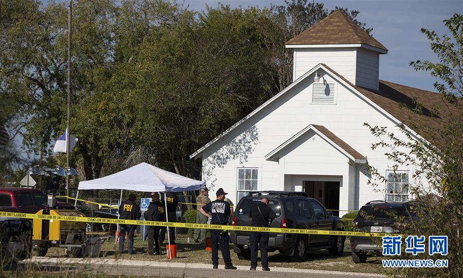 11月5日,在美國(guó)得克薩斯州南部薩瑟蘭斯普林斯鎮(zhèn),執(zhí)法人員在槍擊事件現(xiàn)場(chǎng)工作。美國(guó)得克薩斯州南部薩瑟蘭斯普林斯鎮(zhèn)一所教堂5日發(fā)生槍擊事件。警方向當(dāng)?shù)孛襟w證實(shí),槍擊至少造成27人死亡、多人受傷。 新華社/美聯(lián)