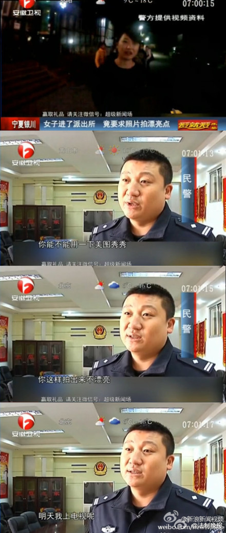 人民網(wǎng)北京11月4日電 據(jù)寧夏回族自治區(qū)公安廳官方微博消息,日前,寧夏銀川,一名女子因搶奪執(zhí)法記錄儀,阻撓執(zhí)法被警察帶走。民警在審訊室準(zhǔn)備對(duì)其拍照時(shí),女子竟然要求民警用美圖軟件,聲稱:“你這樣拍出來(lái)不漂亮,明天我上電視吶。”