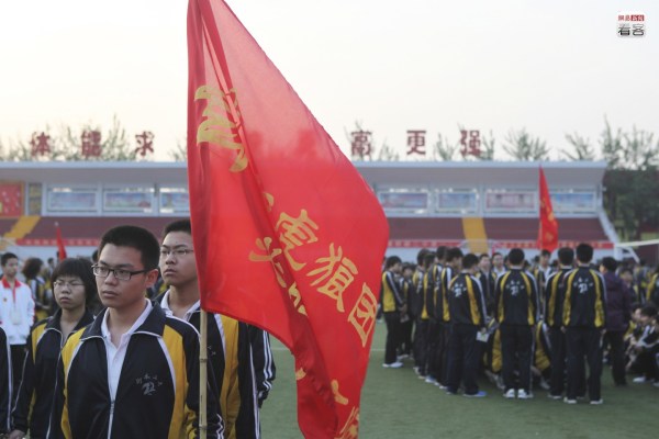 這樣的誓師大會(huì)每年都會(huì)舉行,而類似于誓師的各種勵(lì)志行動(dòng)在這里都相當(dāng)常見(jiàn)。圖為2012年5月1日,衡水二中操場(chǎng)上,一名學(xué)生舉著寫有“虎狼團(tuán)”字樣的旗幟參加跑操。