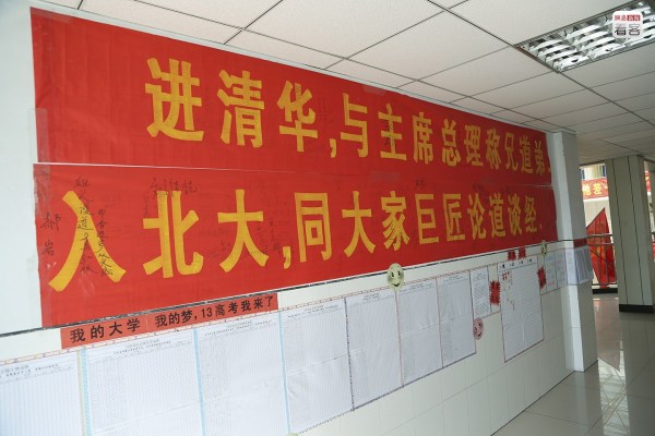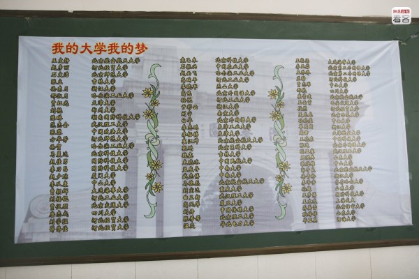 每當(dāng)空閑的時(shí)候,她便望向路對(duì)面校門口的展板上那張考上清華、北大學(xué)生與校長(zhǎng)的大合影。她希望明年在這里也能看到女兒的身影。