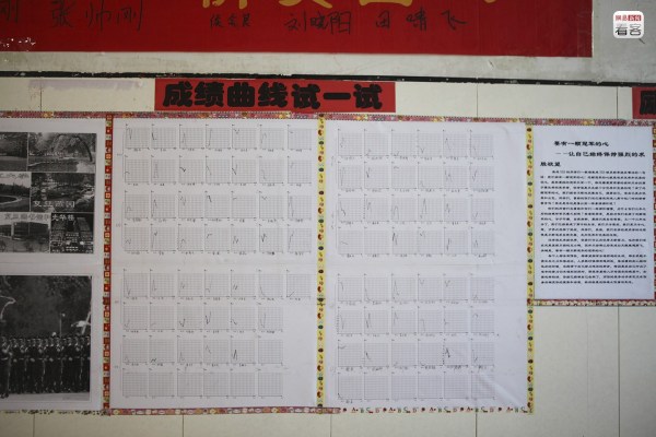 圖為2013年5月10日,學(xué)校走廊上貼著的“成績(jī)曲線”,將每個(gè)學(xué)生歷次考試成績(jī)以曲線的方式展現(xiàn)。而這樣類似的成績(jī)表、成績(jī)單布滿了走廊的每一面墻。