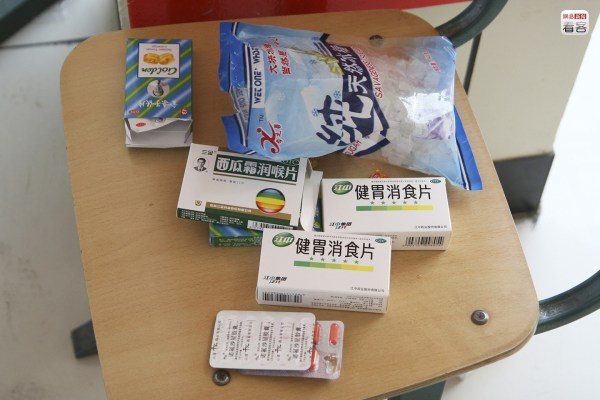 圖為2009年6月2日,教室椅子上放置了各種常用的藥品。