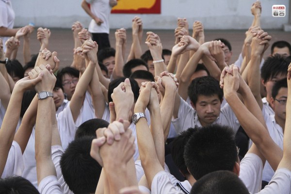 高考進(jìn)行前,學(xué)校還會(huì)帶領(lǐng)學(xué)生進(jìn)行最后一輪鼓勁,老師們穿著紅色T恤,背后寫著“和你在一起”,學(xué)生們則集體穿著白色T恤,在老師的帶領(lǐng)下喊口號(hào)。圖為2011年6月8日,學(xué)生們即將參加高考。