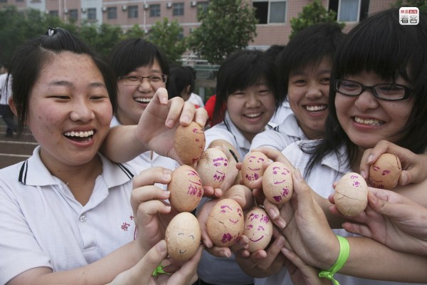 吃“幸運(yùn)蛋”、過(guò)“成功門”也是學(xué)校每到高考前夕都會(huì)準(zhǔn)備的活動(dòng)。圖為2009年6月7日,學(xué)生們拿著畫著笑臉的雞蛋。