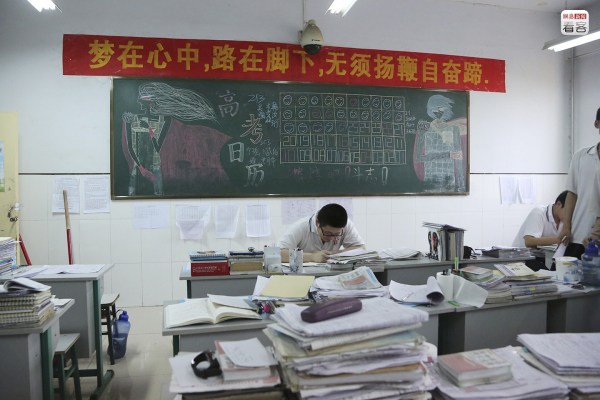很難說(shuō)在這種狂熱的氣氛下,學(xué)生們是不是真的能靜下心來(lái)。與狂熱氣氛相對(duì)的,是“冷”、“靜”這樣的詞匯的常見(jiàn),不少教室也貼著“冷靜”的提示。圖為2012年6月2日,學(xué)生們準(zhǔn)備高考。