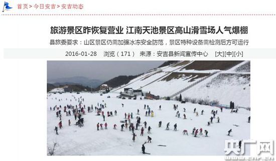 雖然安吉縣委宣傳部副部長祝青稱滑雪場營業(yè)馬上就結(jié)束了,但根據(jù)安吉縣政府官方網(wǎng)站報(bào)道,1月28號,江南天池滑雪場恢復(fù)營業(yè),人氣爆棚。