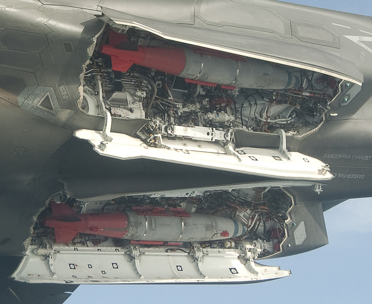 3月2日,美國洛-馬公司生產(chǎn)的F-35B BF-03試驗機加掛兩枚JDAM制導炸彈升空試飛。試飛過程中,F(xiàn)-35B開啟隱藏式彈艙玩起橫滾機動。圖為-35B BF-03隱藏式彈艙細節(jié)。