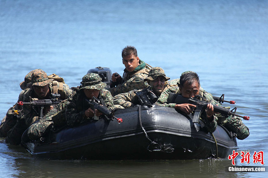 4月25日,美國(guó)與菲律賓“肩并肩2012”聯(lián)合軍演參演部隊(duì)在菲律賓南部巴拉望省普林塞薩港市的阿魯甘灣舉行“兩棲登陸”演練,美菲雙方近百名海軍陸戰(zhàn)隊(duì)士兵參加。這也是美菲“肩并肩2012”聯(lián)合軍演開幕10天以來,開放媒體采訪規(guī)模最大的一場(chǎng)軍事演習(xí)活動(dòng)。圖為美菲海軍陸戰(zhàn)隊(duì)士兵混合編隊(duì),搭乘小艇抵達(dá)演習(xí)地點(diǎn)。張明 攝