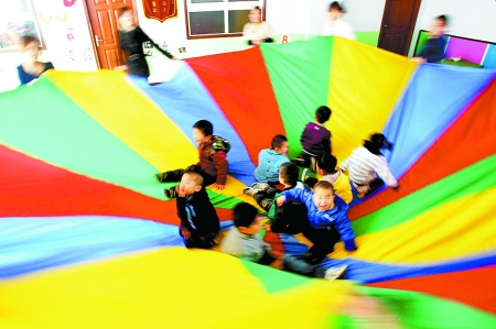 昨天上午10時許,記者來到鄭州康達(dá)能力訓(xùn)練中心,未走進(jìn)教室,已聽到孩子們“嘰嘰喳喳”的叫聲。在其中一教室中看到,100多個可愛的孩子正在進(jìn)行康復(fù)訓(xùn)練,有的在老師及家長配合下做模式操,有的正在做親子游戲。