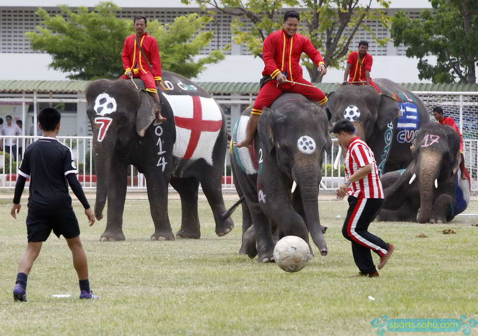 6月9日,學(xué)生們與身上畫(huà)有世界杯參賽球隊(duì)國(guó)旗圖案的大象踢足球。 當(dāng)日,在泰國(guó)大城府舉行了一場(chǎng)有大象參與的“世界杯”足球比賽。 新華社/路透