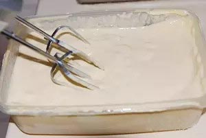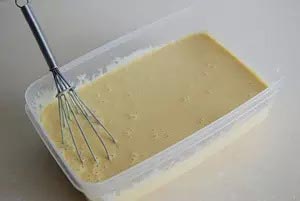 8、等冰淇淋剛開始結冰時取出容器,用打蛋器攪打一會兒,之后每隔30分鐘取出攪打一次,共打4次以上即可。