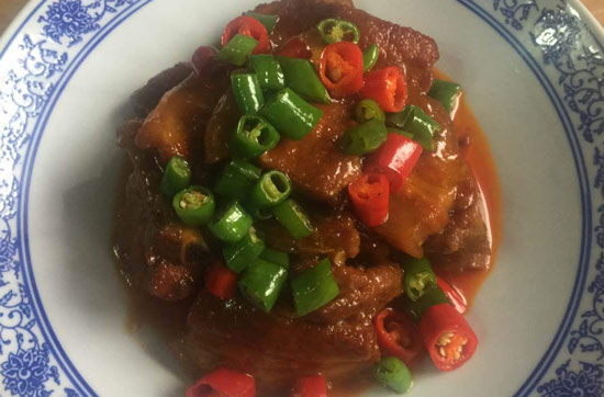 5、倒入五花肉和排骨,大火收汁八分鐘即可。