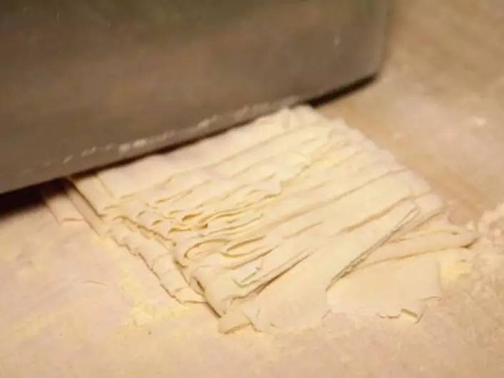 高筋面粉來(lái)和面,用搟面杖反復(fù)搟二十多分鐘,直到面餅微薄透光。這樣做出的面條,經(jīng)過(guò)煮制后口感才會(huì)筋道軟滑。