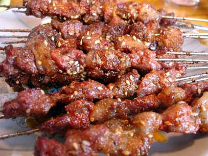 烤約兩分鐘之后,翻面,依次撒芝麻、孜然、再烤一兩分鐘,肉已經(jīng)九分熟時,最后撒上辣椒粉。也有在九分熟時,加糖的,糖能入味,糖化了之后,串亮,顏色漂亮。 烤好出爐之前,串最好反復擠壓,讓烤出的肉汁與調(diào)料充分融合入味。