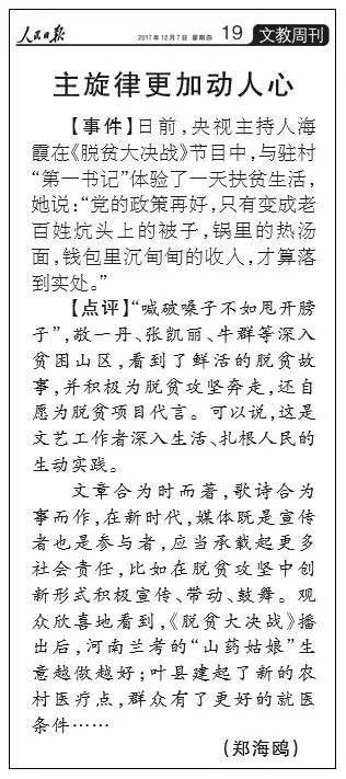 評論中還指出,文章合為時而著,歌詩合為事而作,在新時代,媒體既是宣傳者也是參與者,應(yīng)當(dāng)承載起更多社會責(zé)任,比如在脫貧攻堅中創(chuàng)新形式積極宣傳、帶動、鼓舞。觀眾欣喜地看到,《脫貧大決戰(zhàn)》播出后,河南蘭考的“山藥姑娘”生意越做越好;葉縣建起了新的農(nóng)村醫(yī)療點,群眾有了更好的就醫(yī)條件……