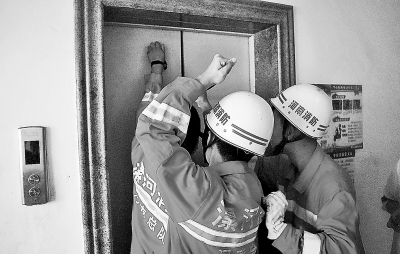 漯河消防官兵試圖打開電梯門,救出被困的人。