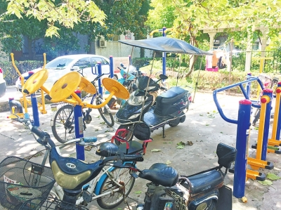 在大門口東側(cè)花壇旁有一塊空地,不大的廣場(chǎng)上,安裝有五六組健身器材。記者注意到,個(gè)別健身器材四周被自行車、電動(dòng)車包圍著,如果想要進(jìn)去鍛煉,必須把車輛挪開(kāi)。