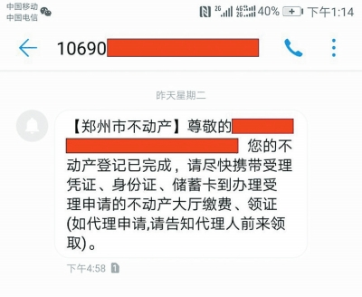 大河報記者了解到,鄭州市不動產登記中心目前正式推出了業(yè)務辦結的短信提醒服務。當不動產登記部門在辦結申請人的相關申請后,便會給申請人(代理人)發(fā)去短信,提醒其及時前往不動產登記部門領取不動產登記證書、證明?!皬臉I(yè)務辦結到領證還有一些內部流轉程序,一般情況下,我們都是在繕證完成后24小時發(fā)送短信?!毕嚓P負責人介紹說。