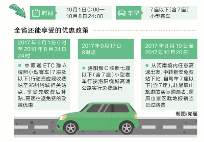 同時,全省還能享受到除高速免費以外的其他優(yōu)惠政策:從2017年9月1日0時至2018年8月31日24時,中原通ETC豫A牌照小型客車(7座及以下)行駛嘉應(yīng)觀收費站至鄭州繞城相關(guān)站點,享受先收費后補貼、高速往返免費的政策優(yōu)惠;2017年9月17日8時起,洛陽豫C牌照7座以下(含7座)小型客車行駛洛陽繞城高速公路實行免費通行;2017年8月19日至2017年10月20日,從河南境內(nèi)任意高速出發(fā),中轉(zhuǎn)新安縣下站,自駕7座以下(含7座)小型客車赴黛眉山旅游的實際購票者,黛眉山景區(qū)就地報銷當日過路費。